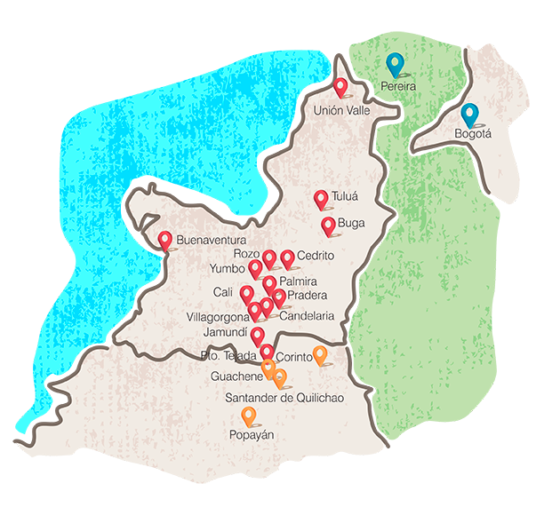 Bogota, Cali, Medellin, Piendamo, Florida, Pasto, Yumbo, Buenaventura, Tuluá, Jamundí, Unión Valle, Pradera, El Cerrito, Palmira, Candelaria , Villa Gorgona, Santander De Quilichao, Popayán, Corinto Cauca, Popayan, Armenia, Manizales y Pereira.